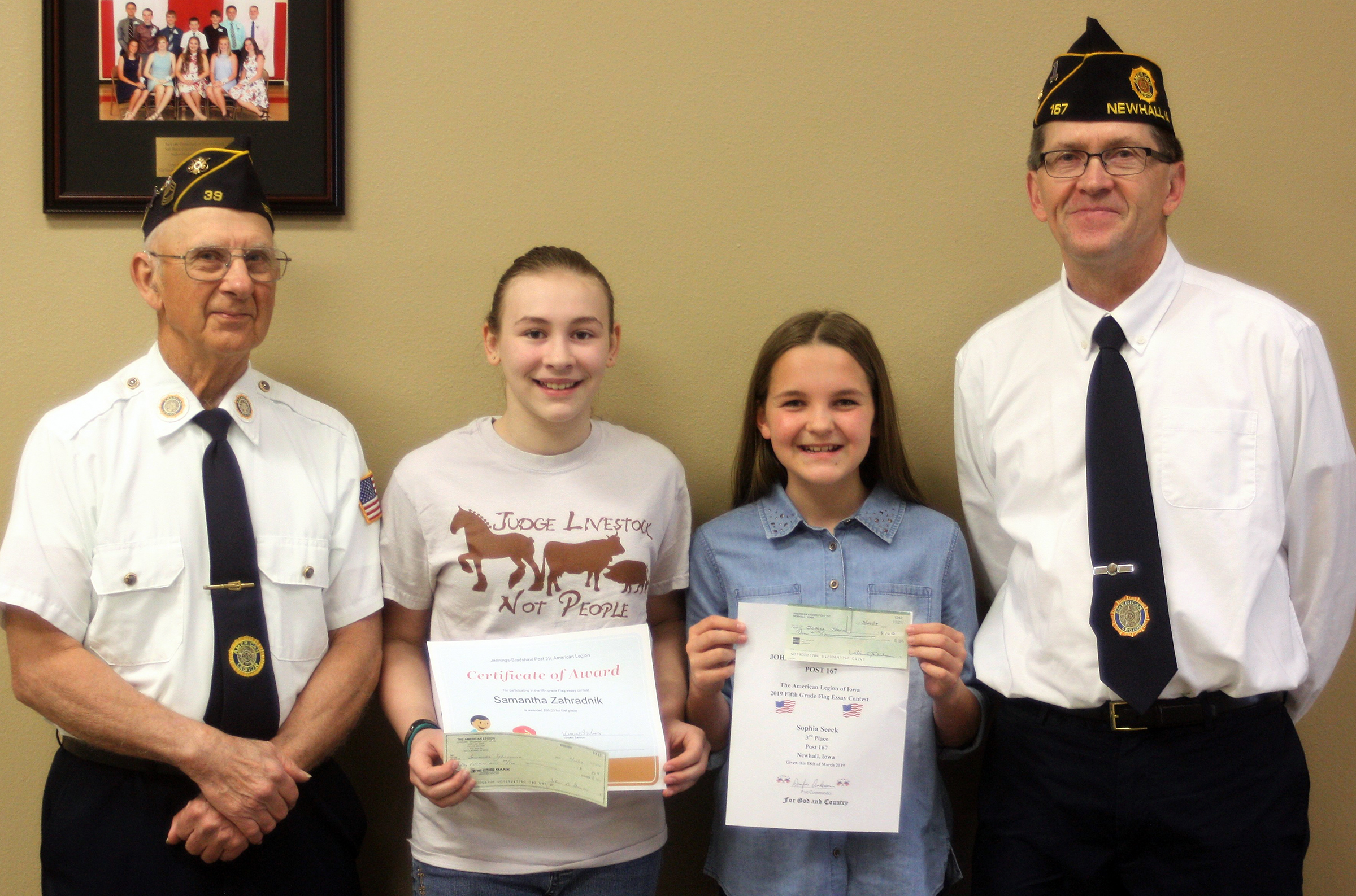 The American Legion sponsored the fifth grade flag essay contest recently. Winners recognized from Central Lutheran, Newhall, were Samantha Zahradnik, Belle Plaine, and Sophia Seeck, Newhall. They shown with Legion members Vince Barloon, Belle Plaine, and Doug Anderson, Newhall.