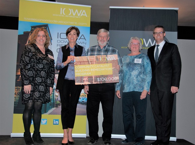 Shellsburg received a grant of $100,000 for renovation and redevelopment of the former State Bank building in the middle of Pearl Street on the west side. Receiving the grant on behalf of Shellsburg were Kate Robertson, Director of Benton Development Group, Mayor Lonnie Speckner, and Council member Nancy Thorkildson. “This is a wonderful opportunity for the City of Shellsburg to partner with a building owner to help rehabilitate a historic building, said Robertson.” “In addition to the renovating the State Bank building into an eatery, Shellsburg is making things happen; The City is also in the process of their downtown sidewalk improvement project.”