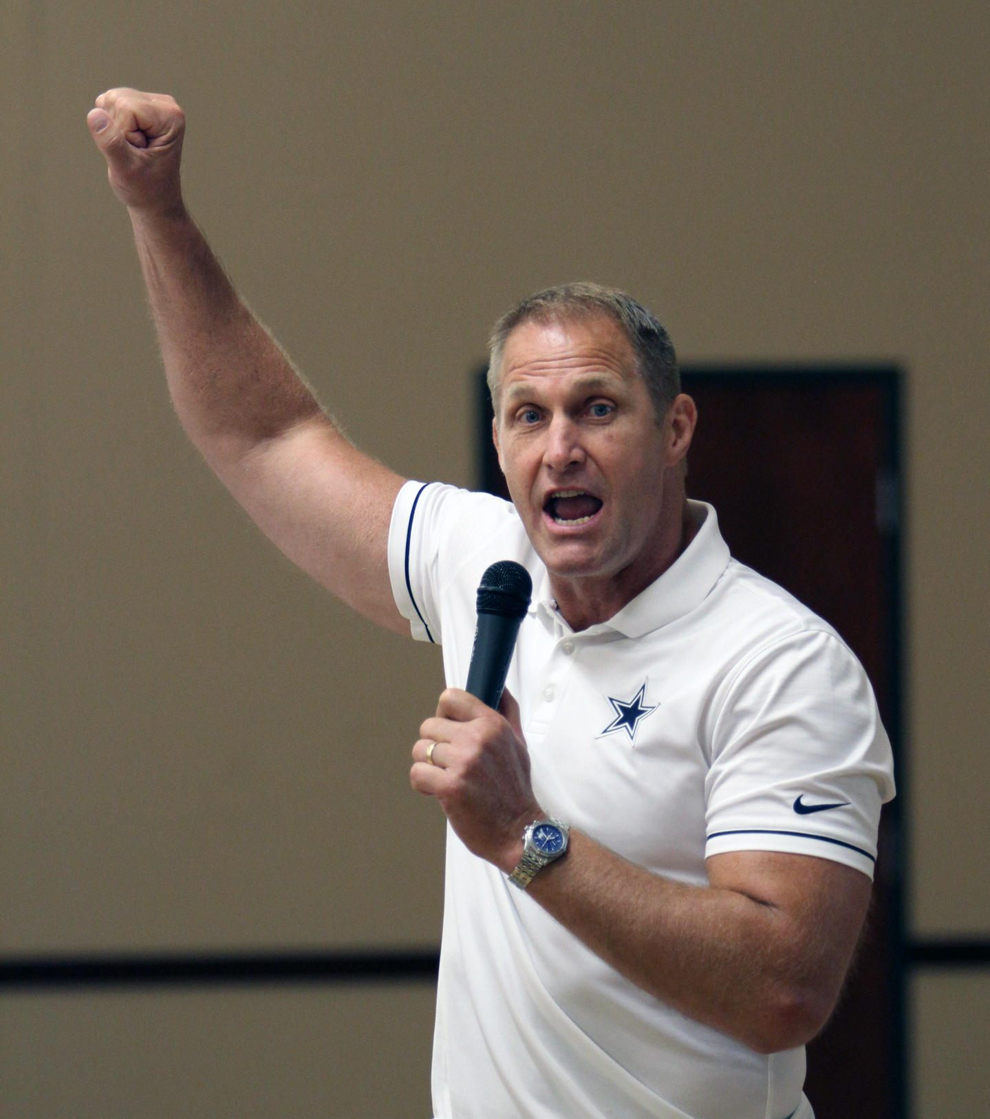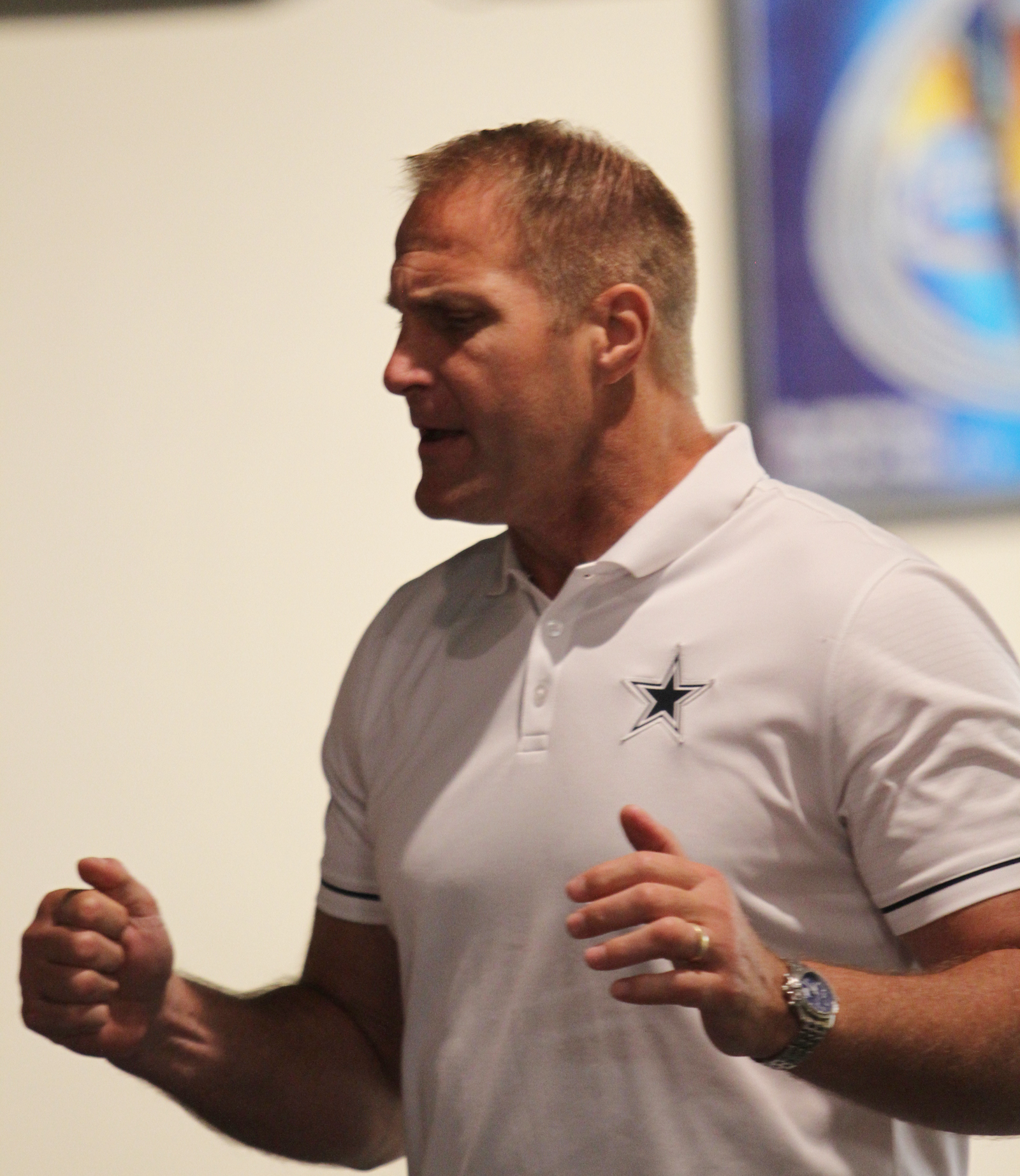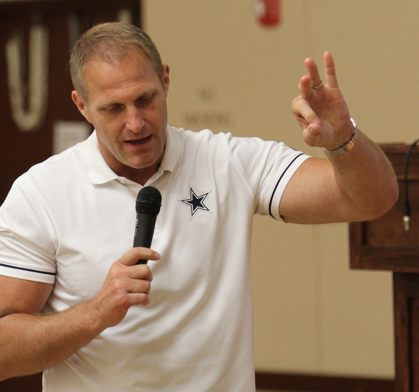 Going back into football was difficult. He went from the cool of England to the humid 90s in Austin. He could lose 14 pounds of water weight each practice. He was drinking by the fire hose but he made the team. The first seven or eight games he was inactive. He stood on the sidelines. He “sucked up his pride” and told Coach Jimmy Johnson he’d do whatever it takes to take the field. “I’ll play on special teams. I’ll run down kickoffs. I’ll run down punts.” Coach said, “OK.” The next game was his first game. His lesson, “Humility trumps pride every time.” He explained, “No matter how good you think you are, everyday is a new day.”