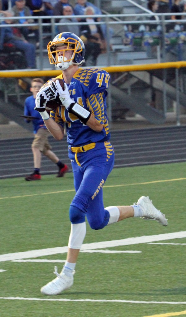 Blake Osborn catches one of his two touchdown passes in action from the opening season win against South Tama.