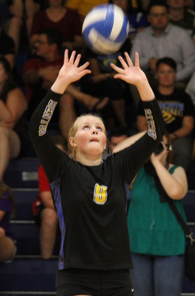 Benton was 25 of 103 in kills with 16 errors. Abby Brunssen had 14 kills. Grace Embretson had 18 assists and 16 digs. Brunssen had 3 blocks. The team was 48 of 53 in serves with 2 aces. Brunssen was 7 of 8. Embretson was 11 of 14. Kayla Lambe was 15 of 15 with 2 aces. Rachel Maschino was 10 of 10. Mallory Thys was 5 of 6.