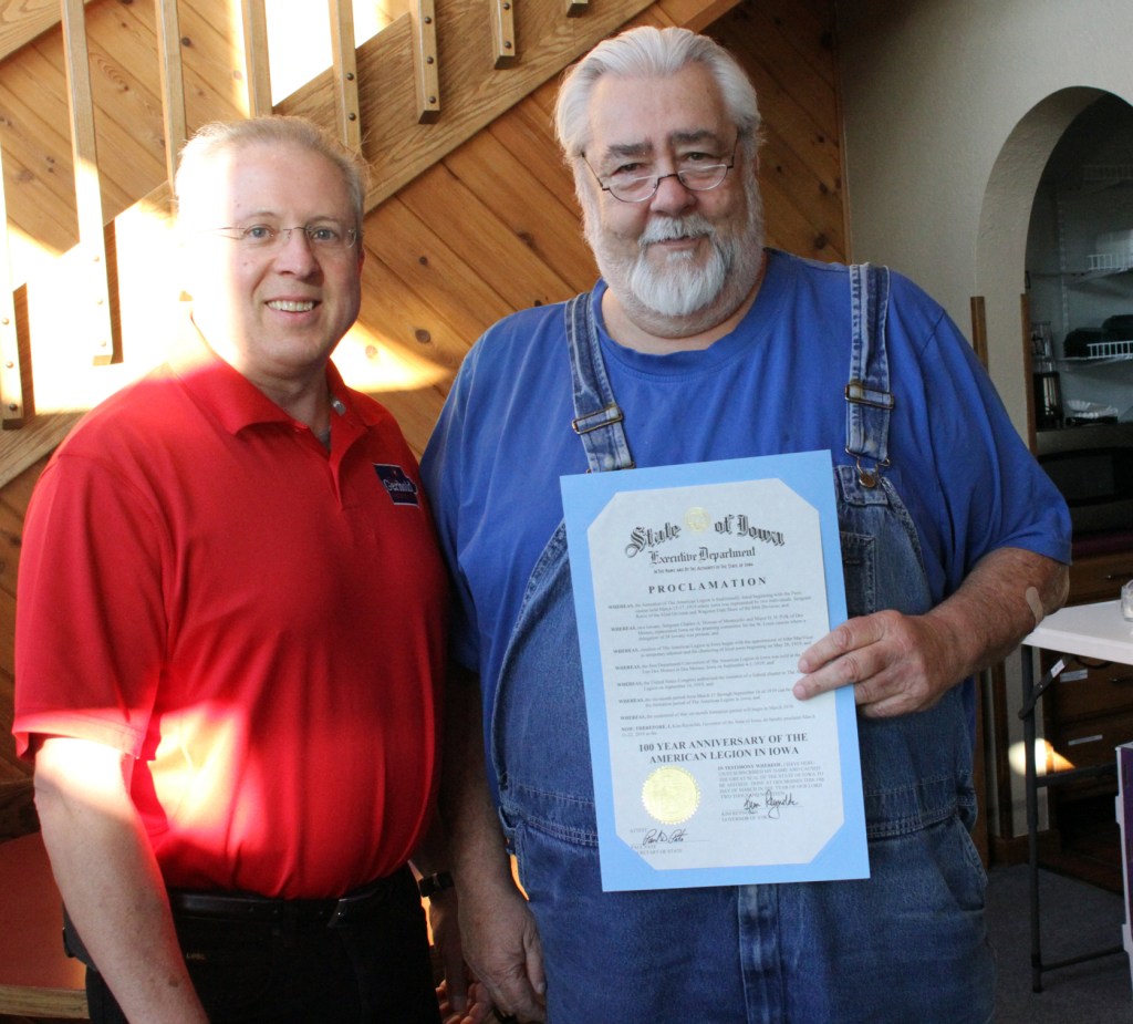 State Rep. Thomas Gerhold presented a proclamation to the Van Horne Legion, noting the Legion’s 100th birthday. Holding the proclamation is Van Horne Commander Mike Kerkman. The meeting was at Tara Hills.