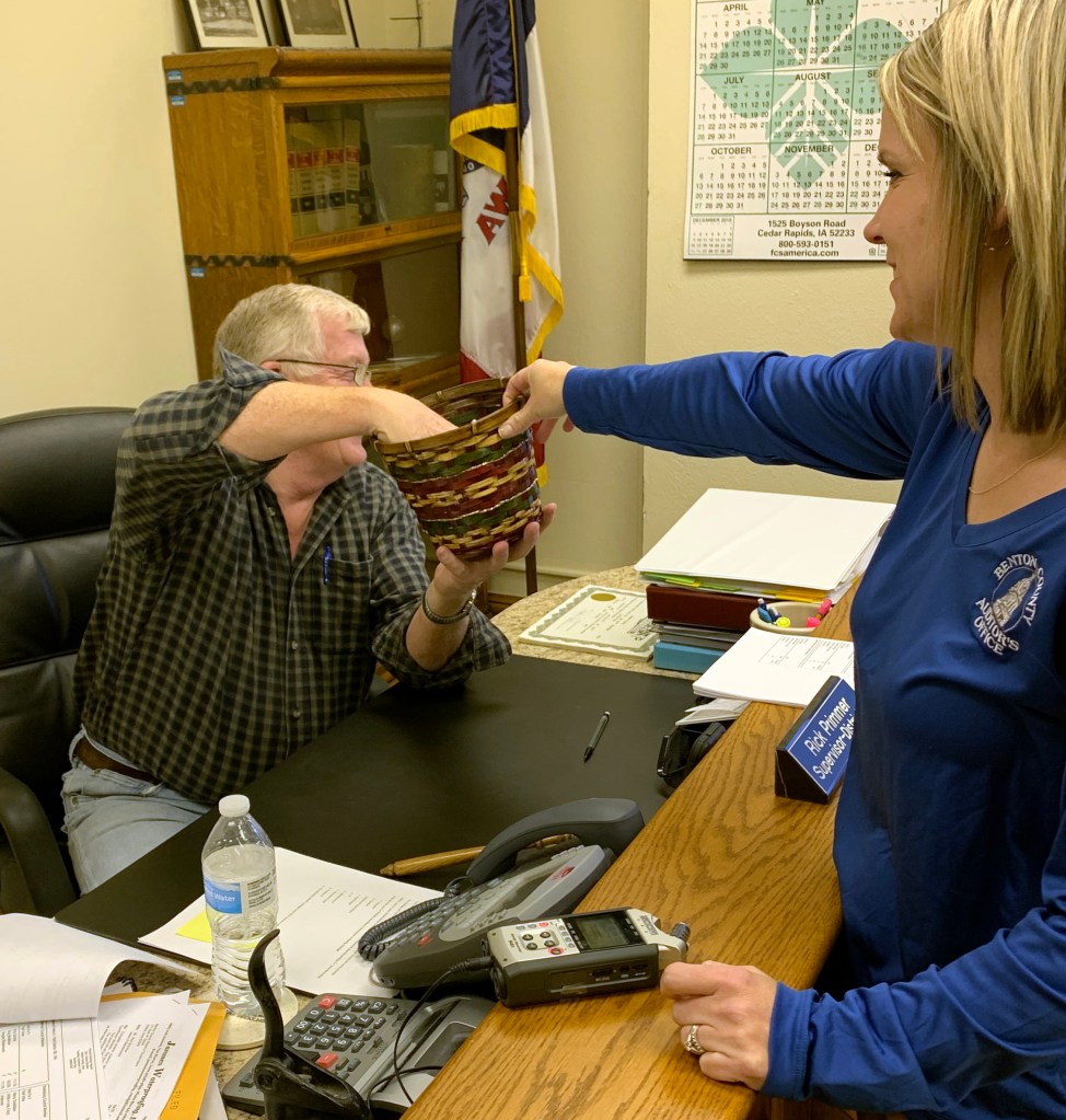 Supervisor Chairman Richard Primmer draws a name from a basket to determine the winner for a seat on the Van Horne City Council, at a meeting Nov. 12 in Vinton. Jarrod Childs’ name was drawn. He was tied with incumbent member Craig Ivester in the Nov. 5 election. Holding the basket was Gina Edler of the auditor’s office. Submitted photo from the courthouse.