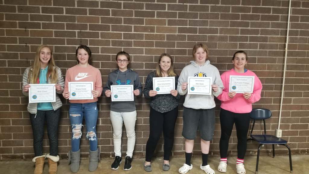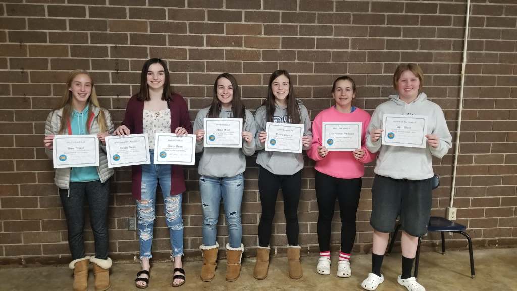 JV Team Honors. Bree Shaull, utility player; Grace Bean, MVP and MVP offense; Abbie Miller, MVP defense; Emma Drahos, coach’s award; Lilly Fowler-Phillippe, team spirit; and Abbi Sieck, rookie of the year.