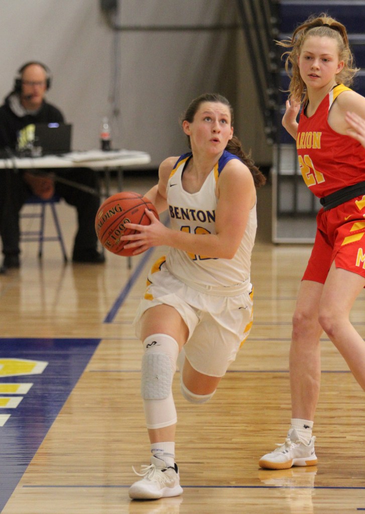 After leading, 7-4, in the first quarter, No. 2 Marion rallied for 18 points in the second, 233 in the third and 17 in the fourth for a WaMaC win. Jenna Twedt led Benton with 8 points. With 5 rebounds each were Twedt and Alyse Harvey. Twedt had two assists. The team was 9 of 34 in shooting, 2 of 15 for three-pointers, and had 30 rebounds.