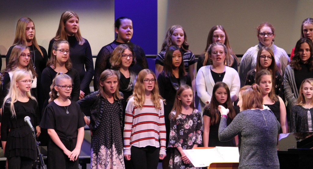 Alyssa Schmuecker leads the seventh grade girls’ choir at the Holiday Prelude middle school concert, Nov. 26, in Van Horne.