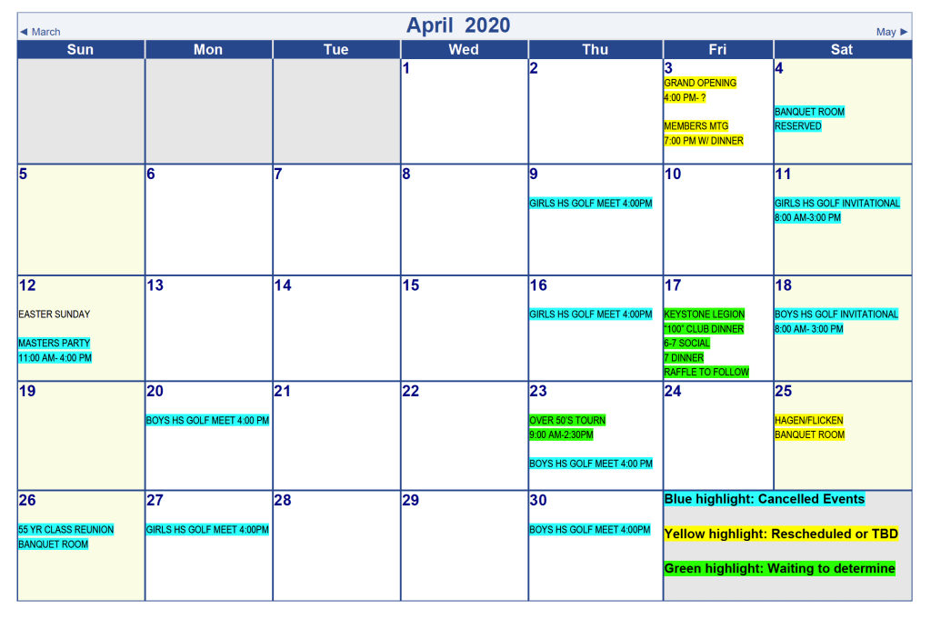 Dates Cancelled/Rescheduled: I have added the calendar to your email. You will see below in the highlighted areas what has been cancelled or rescheduled. We are hopeful to have the remaining events this month.