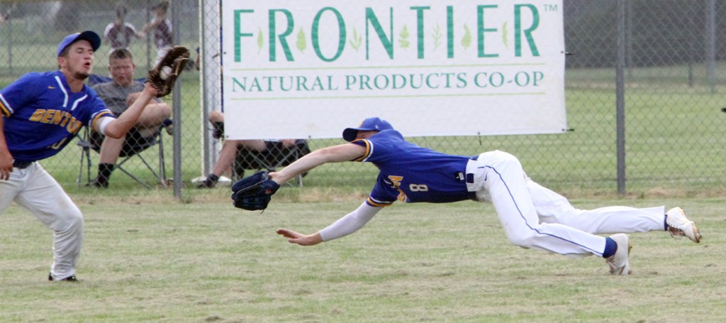 Drew Lange catches the ball while Turner Schroeder helps in action from Benton’s doubleheader against Independence, Monday, June 29.