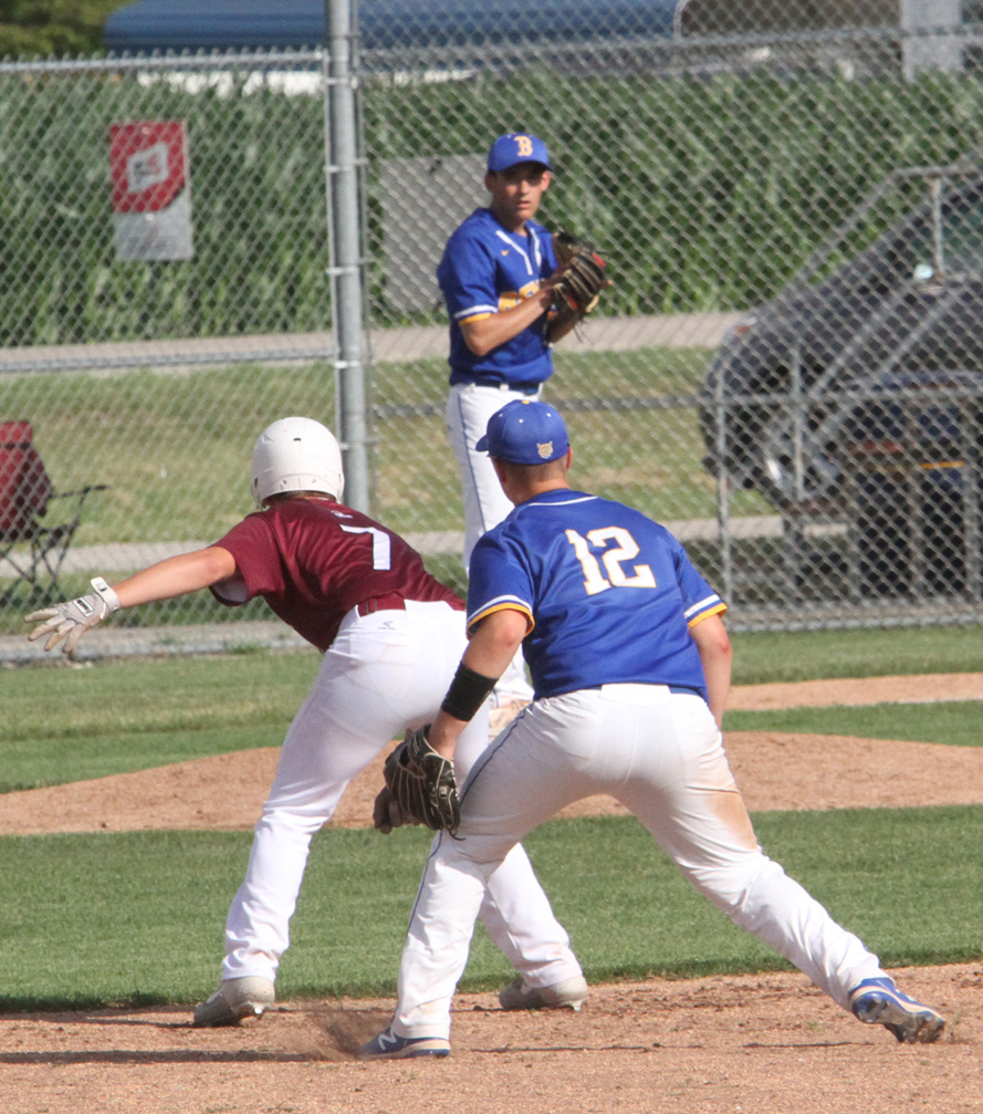 BC pitcher Brady Sadler eyes the baserunner while Cade Timmerman keeps the runner in check against Independence.