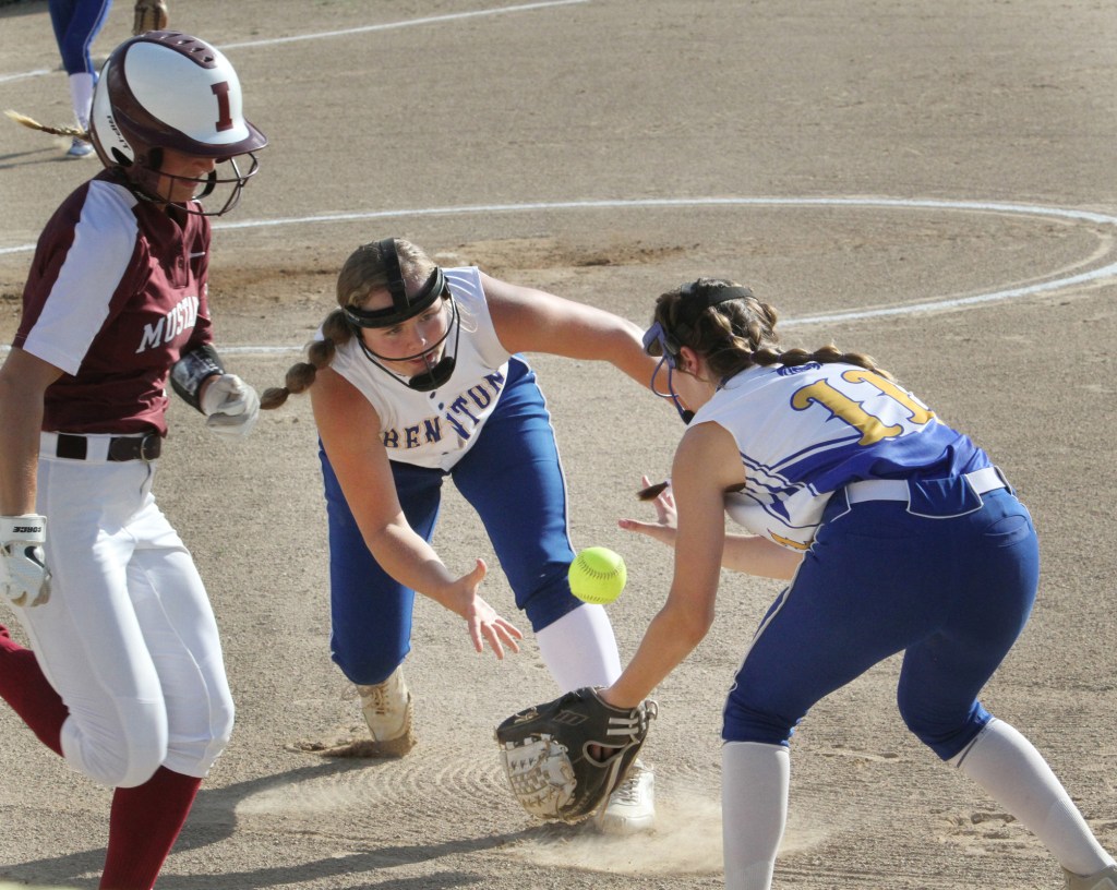 Katelyn Buscher tosses the ball to Brielle Hogan at first base in action from Benton’s doublheader sweep of Independence, Monday, June 29, at Van Horne.