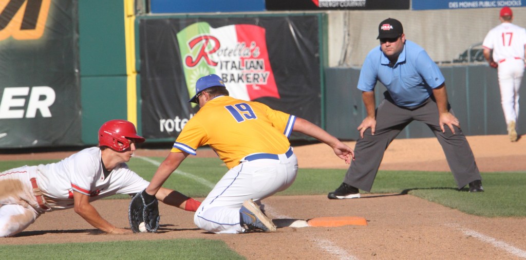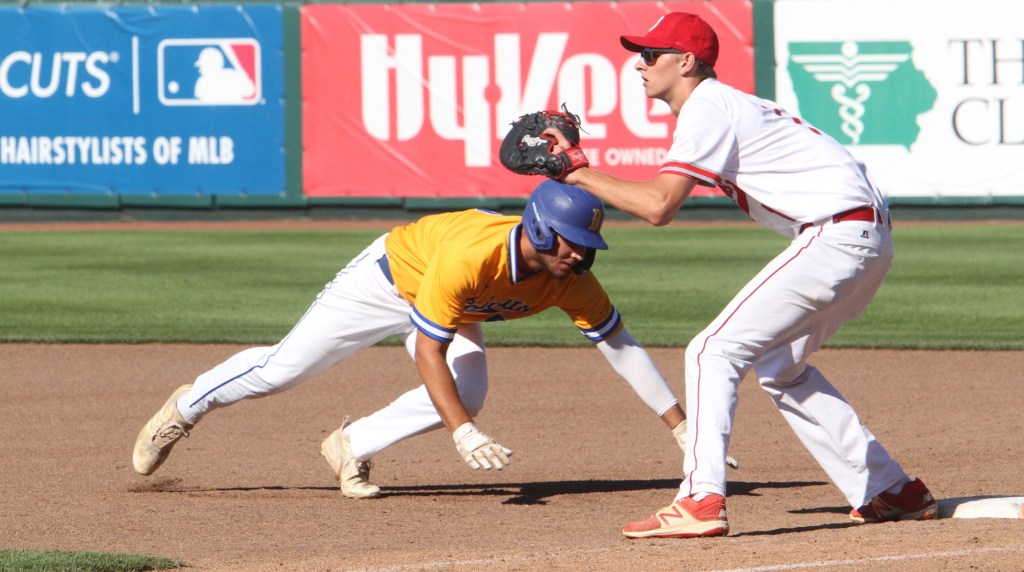 Benton’s Justise McFarland tags a runner out in against Dallas Center-Grimes.