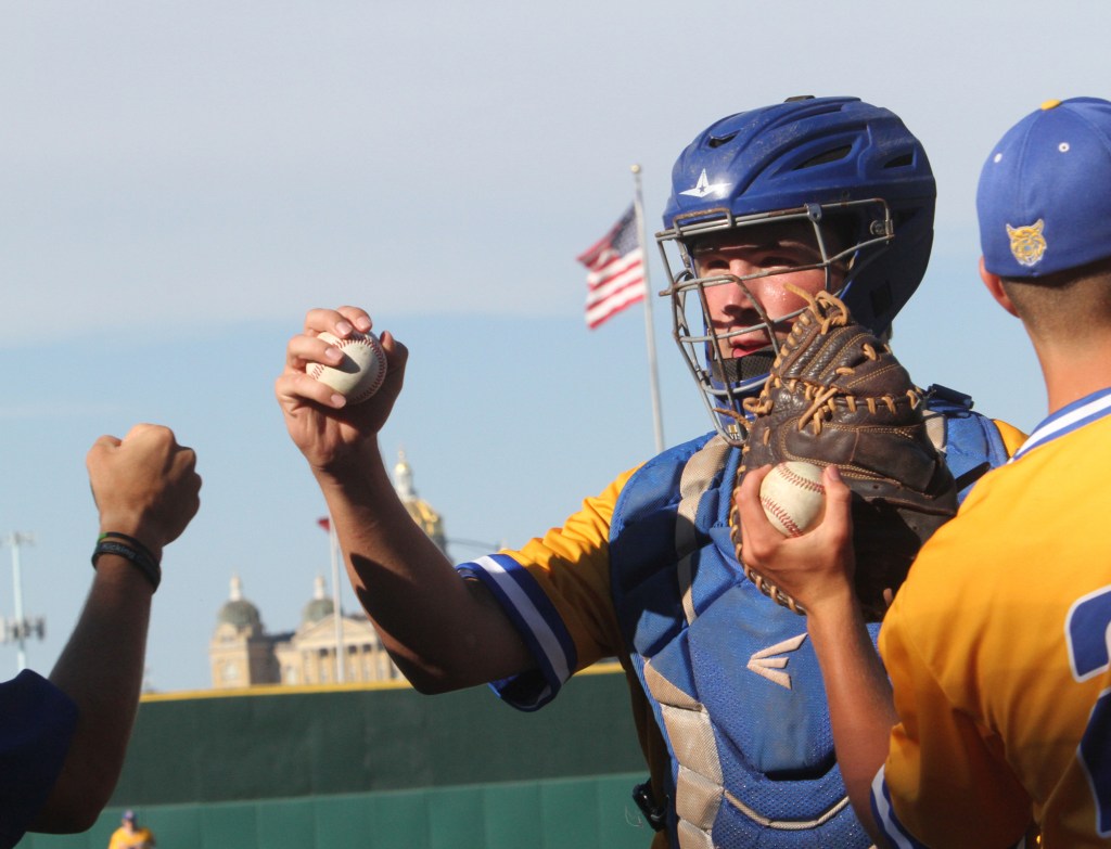 Benton’s Bobcats warm up with the state capitol in the background at Principal Park.