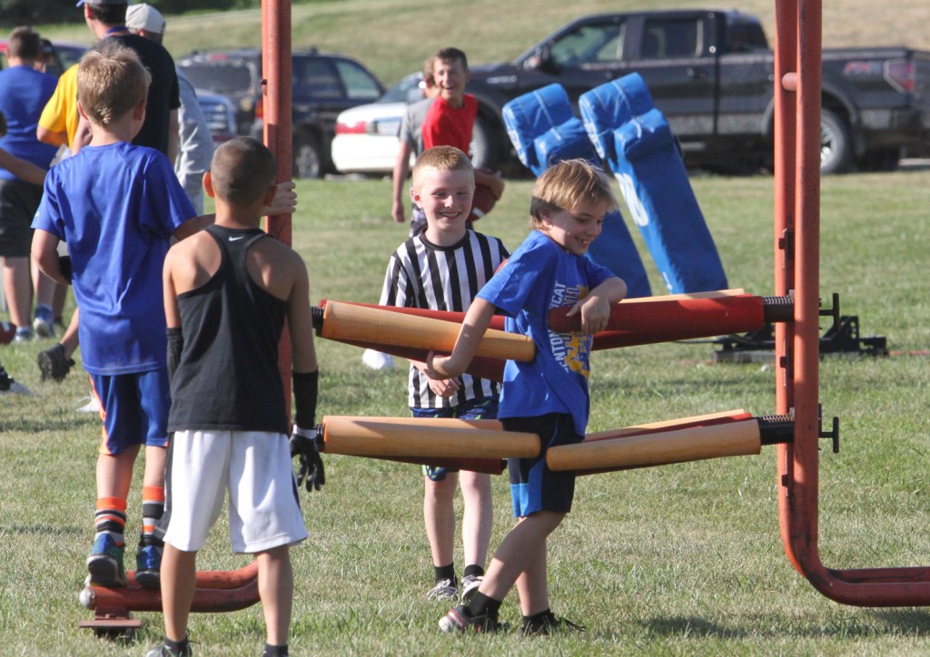Coach Kory Winsor organizes participants at the youth football camp in Van Horne.