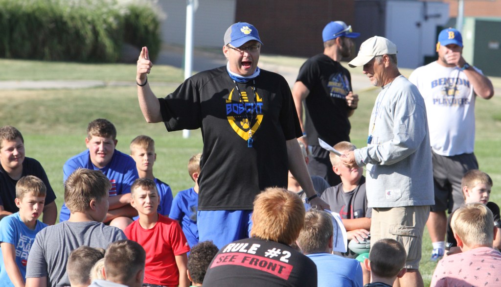Coaches Jeff Zittergruen and Kal Goodchild talk with kids at the football camp for Benton on Aug. 3.