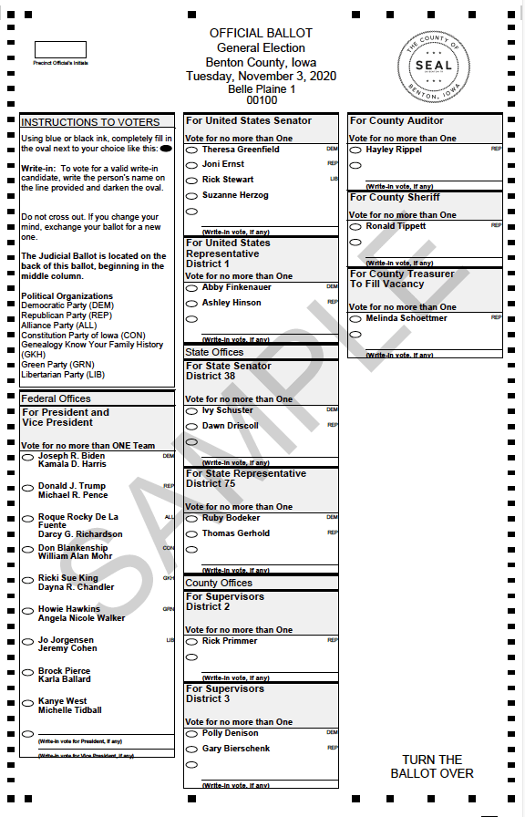 PUBLIC NOTICE is hereby given to the qualified electors of the County of Benton, State of Iowa, that the General Election will be held on Tuesday, the 3rd day of November 2020. The polls for said election shall be open from 7:00 A.M. until 9:00 P.M.