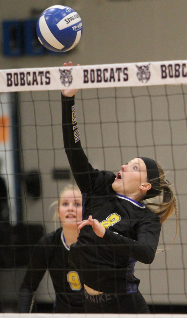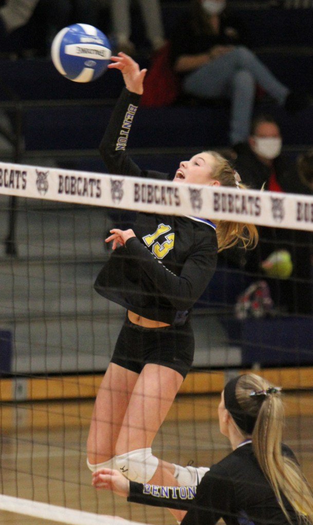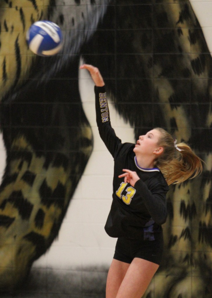 Cailin Keiper hits the ball for Benton in regional volleyball play.