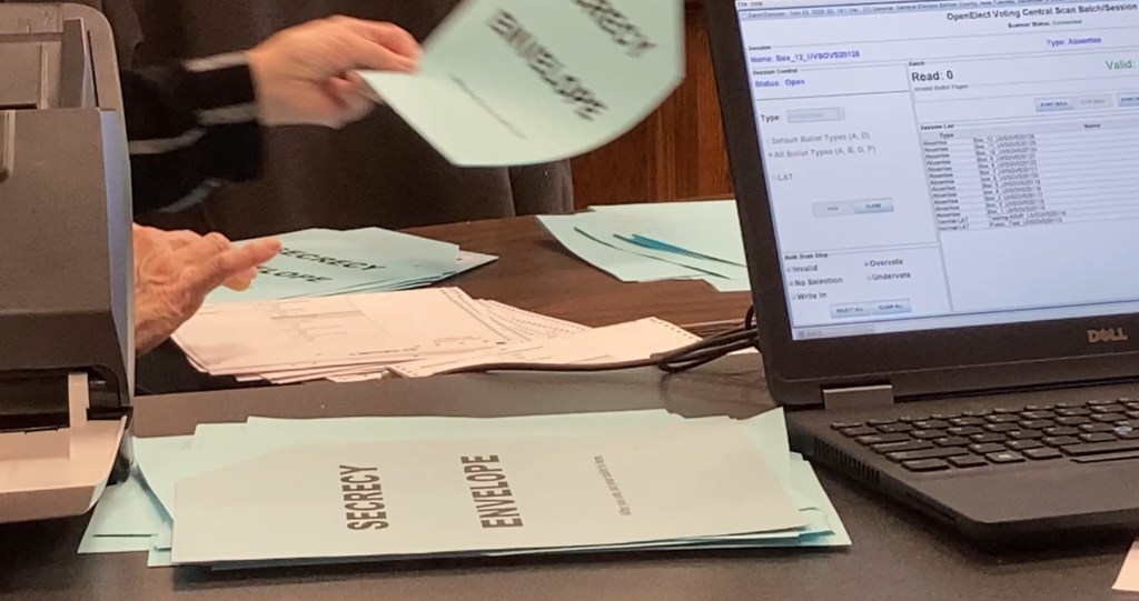 Rather than be anxious about how the vote was going to turn out, I volunteered to help with the results and the massive absentee ballot count. We had eight people, split into four teams, with one Republican and one Democrat in each team. Ballots were in about 16 boxes, each box with about 430 to 450 ballots. Three teams meticulously counted the envelopes. They then opened the envelopes. Pulled the ballots from the blue secrecy envelopes. And then counted the ballots to make sure it matched. Then it came to our team who unfolded each ballot, and ran them through a scanner, 25 at a time.