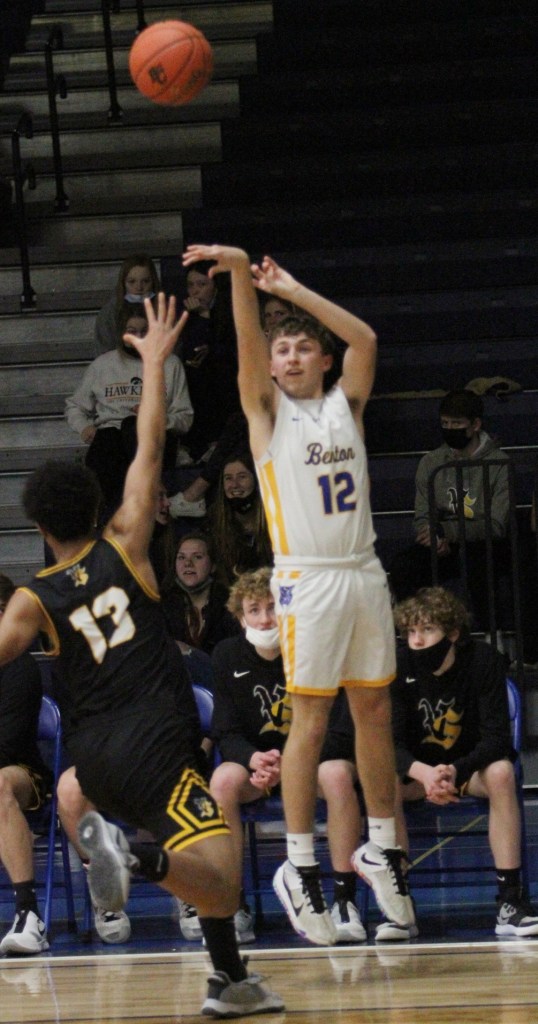 Nate Polansky shoots a three for Benton against Vinton-Shellsburg.