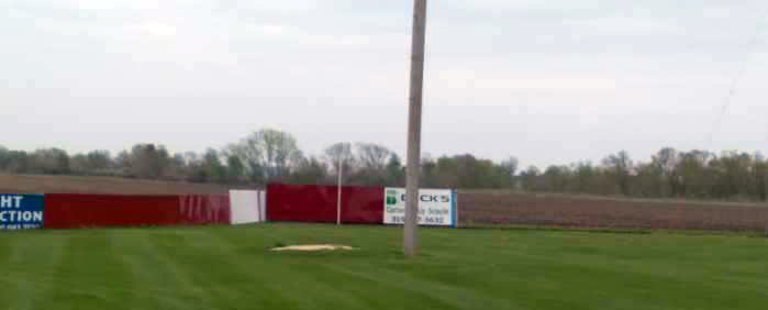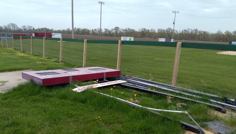 - Approximately 300 foot of outfield fence was blown down, destroying some of the attached signs.One of the pole mounted transformers that power our outfield lights is now laying on the ground behind the first base dugout.