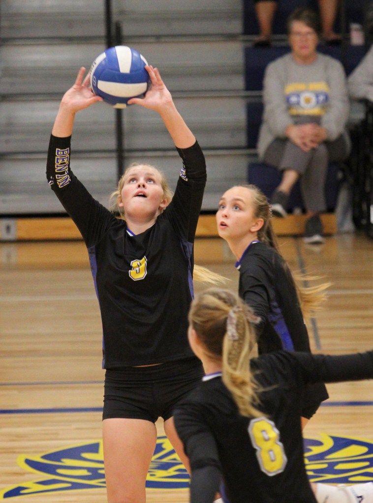 Benton (14-8) picked up a WaMaC win over Williamsburg (10-15), at home in Van Horne. Grace Embretson had 37 assists for Benton. Kiah Coffin had 10. The team was 61 of 149 for kills with 20 errors. Alyssa Tegeler had 22 kills. Embretson added 19, Piper Nelson had 10. Olivia Janss had 21 digs. Embretson had 17 and Piper Nelson added 10. The team was 95 of 105 for serves with 12 aces. With three aces each were Addison Phillips and Nelson.