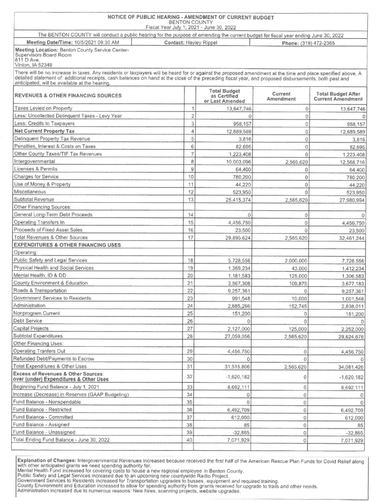 VINTON – An amendment to the current fiscal year’s budget was approved by the Benton County Board of Supervisors at their meeting Tuesday, Oct. 5, at the service center in Vinton.
