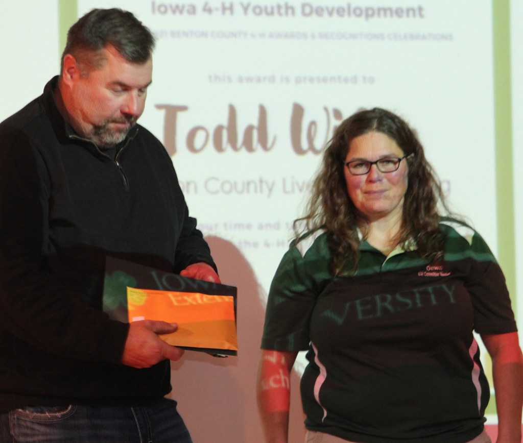 Todd Wiley is honored as an honorary 4-H member. He is shown with Dawn Edler of the 4-H committee.