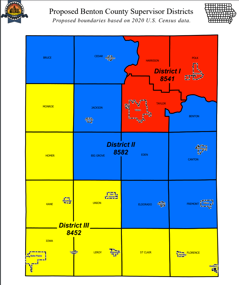 The Benton County Redistricting Committee will hold a public hearing on Monday, January 3, 2022 at 8:00 a.m. in the Benton County Service Center Conference Room, 811 D Ave, Vinton, IA, to hear comments or objections to the proposed supervisor districts. The proposed districts are as follows: