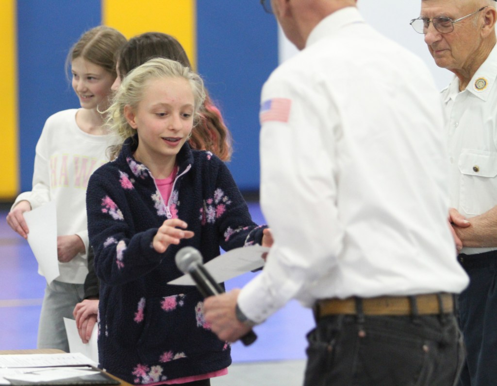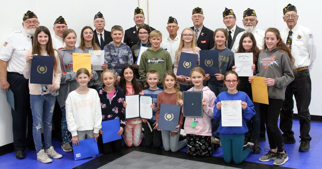 Dave Herman of the Atkins Legion presents a flag essay certificate to Kinley Zittergruen. In back are Ava Thiher and Madison Becker.Aaron George receives an honor on his flag essay from Darrell Schulte, Norway Legion. Donald Jensen, Blairstown, presents an essay certificate to Roxi Benesh.Area fifth graders were honored in Norway recently. In front are Madison Becker, Kinley Zittergruen, Anna Cretin, Aaron George, Roxi Benesh, Rylee Reed and Zoey Hutton. Standing are Shiloh Struck, Lilly Colburn, Makayla Volesky, Hayden Mumm, Emma Kupka, Beckett Sexton, Kennedy Bakker, Alexis Sobaski, Ava, Thiher, and Kacie Benesh. In back are Legion members Donald Jensen, Robert Pickering, Ed Schaeffer, Darrell Schulte, Vince Barloon, Bruce Feuerbach, Leo Hlas and Dave Herman.