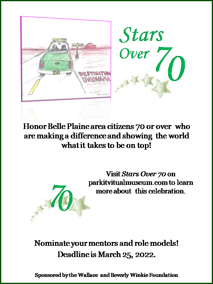 If you know anyone who is a role model, mentor, or leader to others and is over 70 years of age, Stars Over 70 is a great way to honor their contributions! It’s fast and easy to nominate someone. All you need to do is take a few minutes to visit our site (https://www.parkitvirtualmuseum.com/stars-over-70.html), download the nomination form, complete the form, and email it to parkitiowa@gmail.com or mail it to PO Box 291, Belle Plaine.