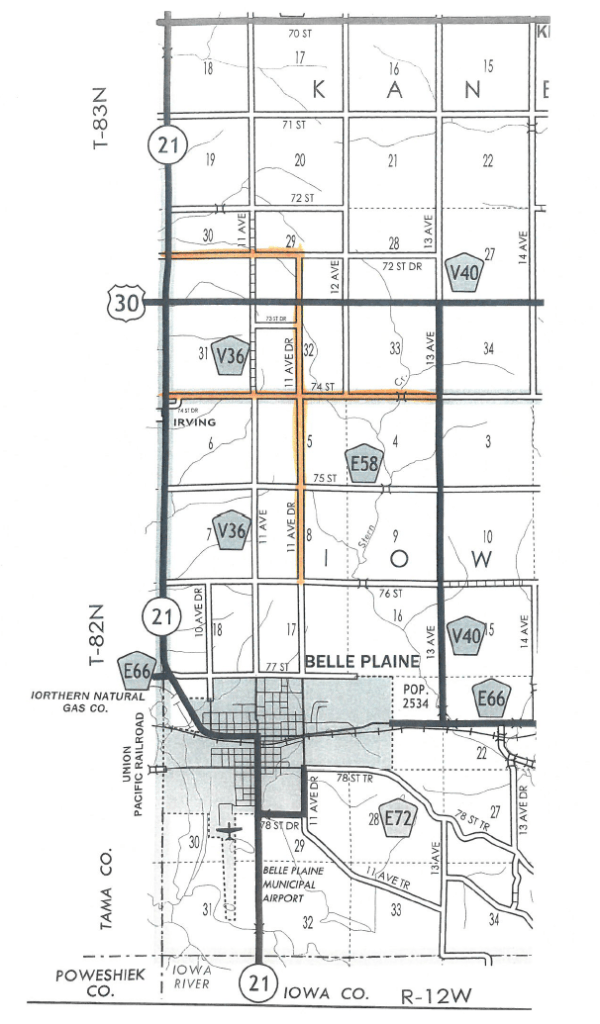 “35 mph on 72nd Street Dr from Ia Hwy 21 east 1.5 miles to the intersection of 11th Avenue Dr and 35 mph on 74th Street from Ia Hwy 21 east 3 miles to the intersection of 13th Avenue and 35 mph on 11th Avenue Dr from 72nd Street Dr south 3.5 miles to the intersection of 76th Street,” and