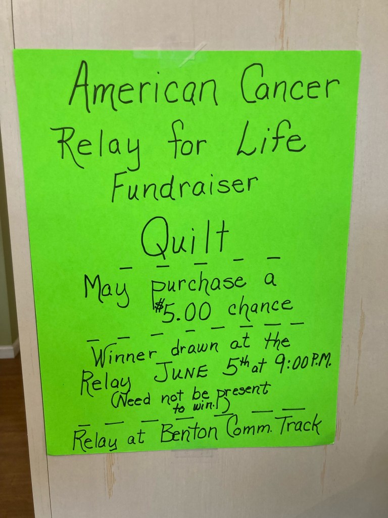 Committee members are selling raffle tickets 1 / $5 or 5 / $20 to support American Cancer Society, and tickets will be available at the Relay For Life on June 5 in Van Horne also. Drawing will be at 8 p.m., need not be present to win.