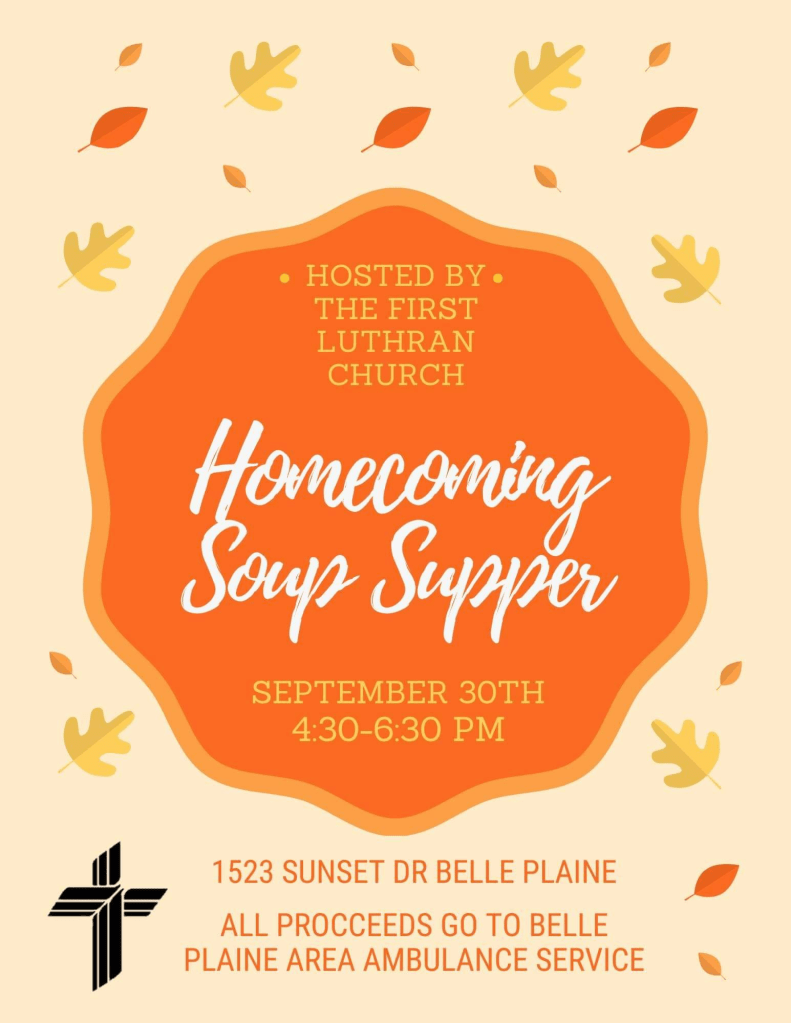 Belle Plaine – Homecoming soup supper at First Lutheran Church, 1523 Sunset Drive, Belle Plaine. 4:30 to 6:30 p.m.