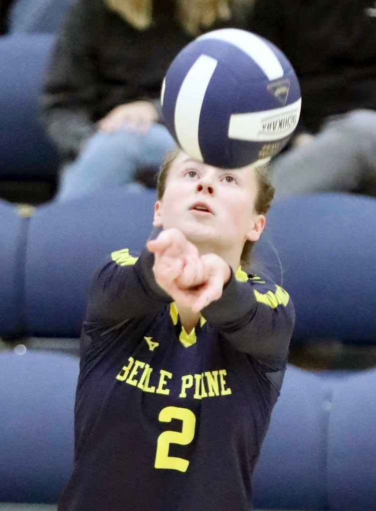 Mandy Chizek had 38 assists for Belle Plaine (18-9). Belle Plaine had 57 kills in 130 attempts with 18 errors. Grace Bean had 23 kills. Jacey Reineke had 17. Rachel Benton had 19 digs. Reineke added 17. Alyssa Steinback ahd 13 and Grace Bean had 12. Belle Plaine had five blocks. Kyla Shaull had two. With one each were Chizek, Denisyn Adams and Bean. Belle Plaine 96 of 97 for serves with 23 aces. Reineke had eight aces. Steinback had five. With three each were Benton, Ava Parizek and Bean. Benton was 18 of 18. Parizek was 10 of 10, as was Chizek. Steinback was 18 of 18 and Bean was 13 of 13. Reineke was 27 of 28.