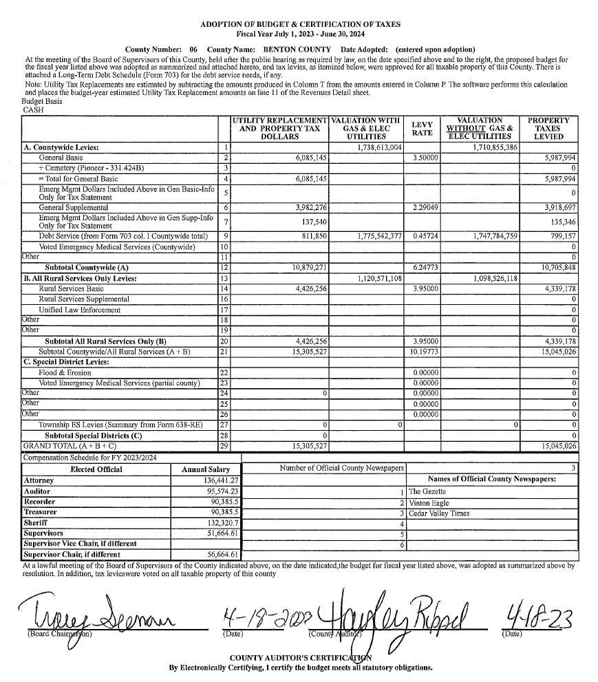 VINTON – The Benton County Board of Supervisors approved its budget for next fiscal year at their meeting Tuesday, April 18, 2023, at the Benton County Service Center Conference Room in Vinton.