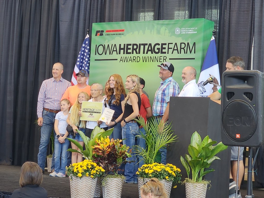 Thursday morning was the awards ceremony for “Century Farms” for families owning their land for 100 years or more. According to https://centuryfarms.iowaagriculture.gov/, these families received the award this year: John Brockschink with his Norway farm owned since 1922, Michael & Lorraine Kerkman with their Van Horne family farm since 1873, Duane & Michelle Koopman with their Newhall family farm since 1915, LaVonne Sass with her Shellsburg family farm since 1907, Merlyn Schanbacher with two Newhall family farms since 1913 and 1874, Virgil & Sharon Schminke with their Vinton family farm since 1918, Lynn & Brenda Selk with their Keystone family farm since 1923, Rita & Relda Selk Pickering with their Keystone family farm since 1884, and Douglass Thompson with his Van Horne farm since 1915. Congratulations to any other Benton County award winners!