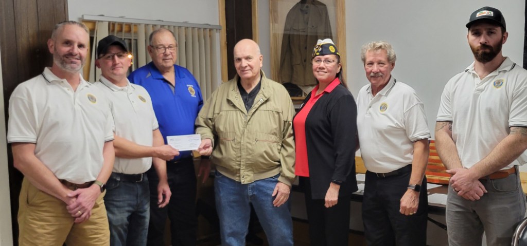 Van Horne Communications presented a donation of $5,000 to the Van Horne Thomas F. Bevins Legion Post, as part of the post’s fund-raiser for its building, which has been used by the post for 50 years. From the left are Legion members Adam Masten, David Frazier, Don Knaack, Wayne Eichmeyer of Van Horne Communications, Third District Commander Dixie Kapayou and Legion members Jay Herman and James Euchner. So far the post has raised $24,200 of its goal of $25,000. The event was held at the hall on Veterans Day. Photo from the Van Horne Legion.