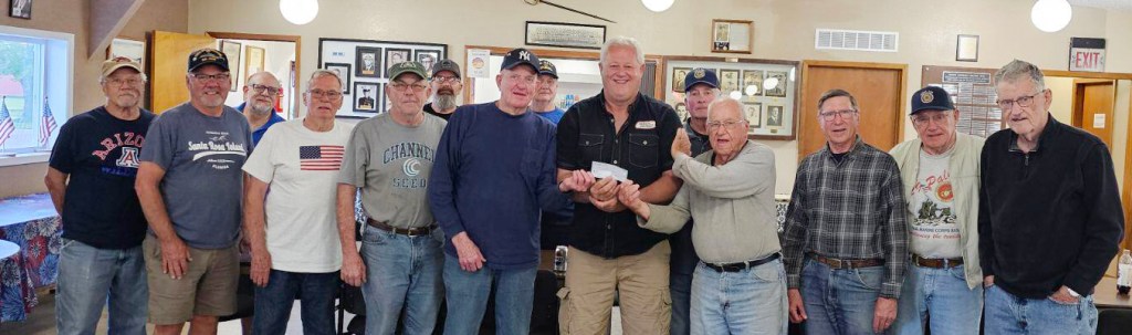 A local UTV ride benefitted the Legion posts in Norway and Van Horne last month. Devin Pickering, center, who coordinated the ride, presented a check to Norway Legion on Tuesday, May 7, 2024. A presentation in Van Horne is planned for May 16. Also helping present the check was Maggie Dvorak, not pictured. Pickering said, “UTV people are generous people who give back to our local patrons.” Submitted photo.