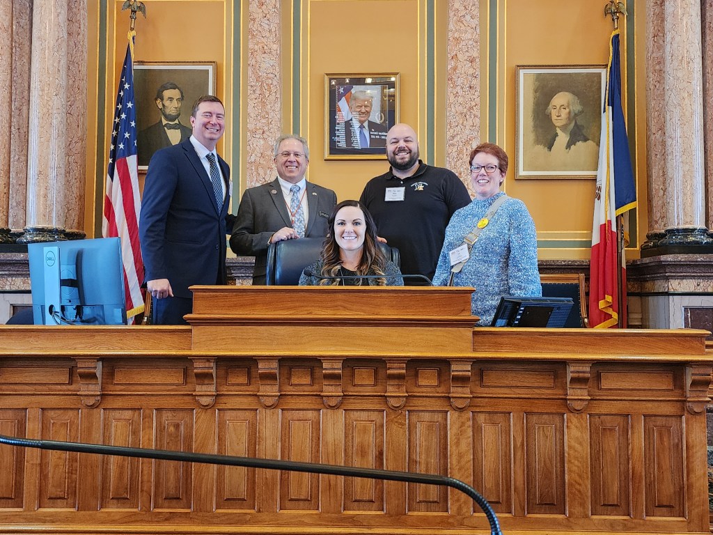 On Tuesday, January 28th, I enjoyed visiting with Vinton-Shellsburg Superintendent Kyle Koeppen, Middle School Principal Alexa Francois, school board member Le Cox, and 7th grade Social Studies teacher Wesley Recker. After discussing the upcoming Education budget for public schools and their priorities, we all were able to find time to venture to the top of the golden dome for a wonderful view of Des Moines. We were very fortunate to have sunny skies and relatively balmy temperatures for late January!