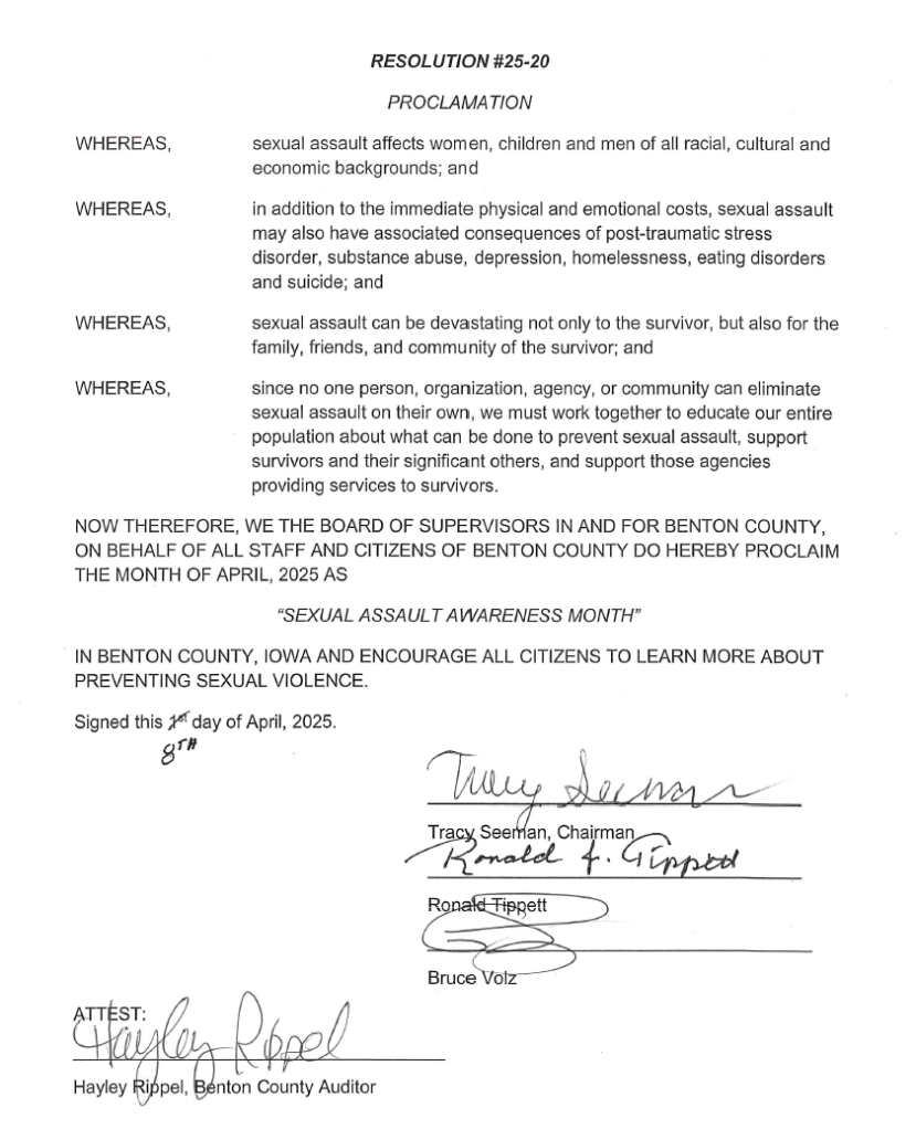 April 9, 2025 magdefrau Proclamation, Benton County, Sexual Assault Awareness Month Share this: Click to share on X (Opens in new window) X Click to share on Facebook (Opens in new window) Facebook Like Loading... Related