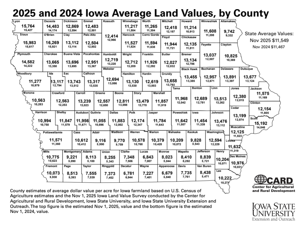 Land values were determined by the 2025 Iowa State University Land Value Survey, conducted in November by the Center for Agricultural and Rural Development at Iowa State and Iowa State University Extension and Outreach. Results from the survey are consistent with results by the Federal Reserve Bank of Chicago, the REALTORS® Land Institute and the U.S. Department of Agriculture, showing only small changes in the land markets.