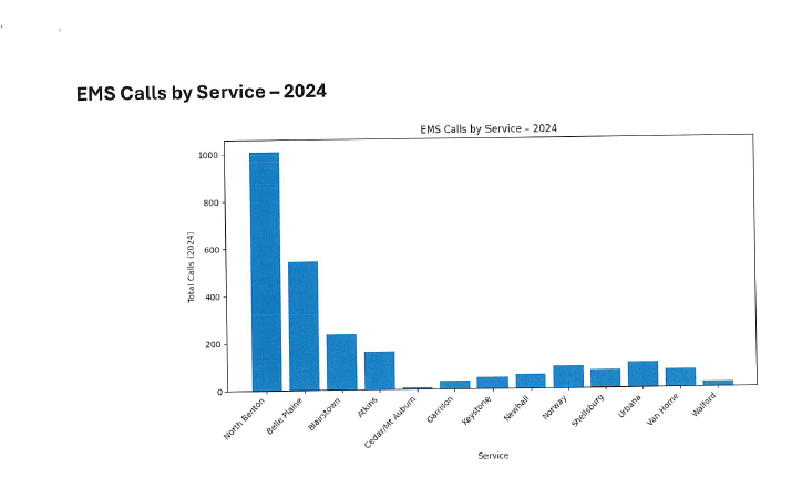 Looking at EMS call volume, North Benton led with 1,008, Followed by Belle Plaine with 543 and Blairstown with 236. Other services and first responders include Atkins, Cedar/Mount Auburn, Garrison, Keystone, Newhall, Norway, Shellsburg, Urbana, Van Horne and Walford.