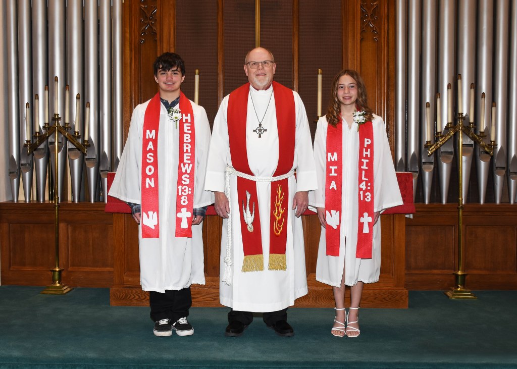 Mia Kenny and Mason Wecker made their public profession of faith and a lifelong pledge of fidelity to Christ in the Rite of Confirmation at St. Stephen’s Lutheran Church, Atkins, on Palm Sunday, March 29. They are pictured with Pastor Doug Woltemath.